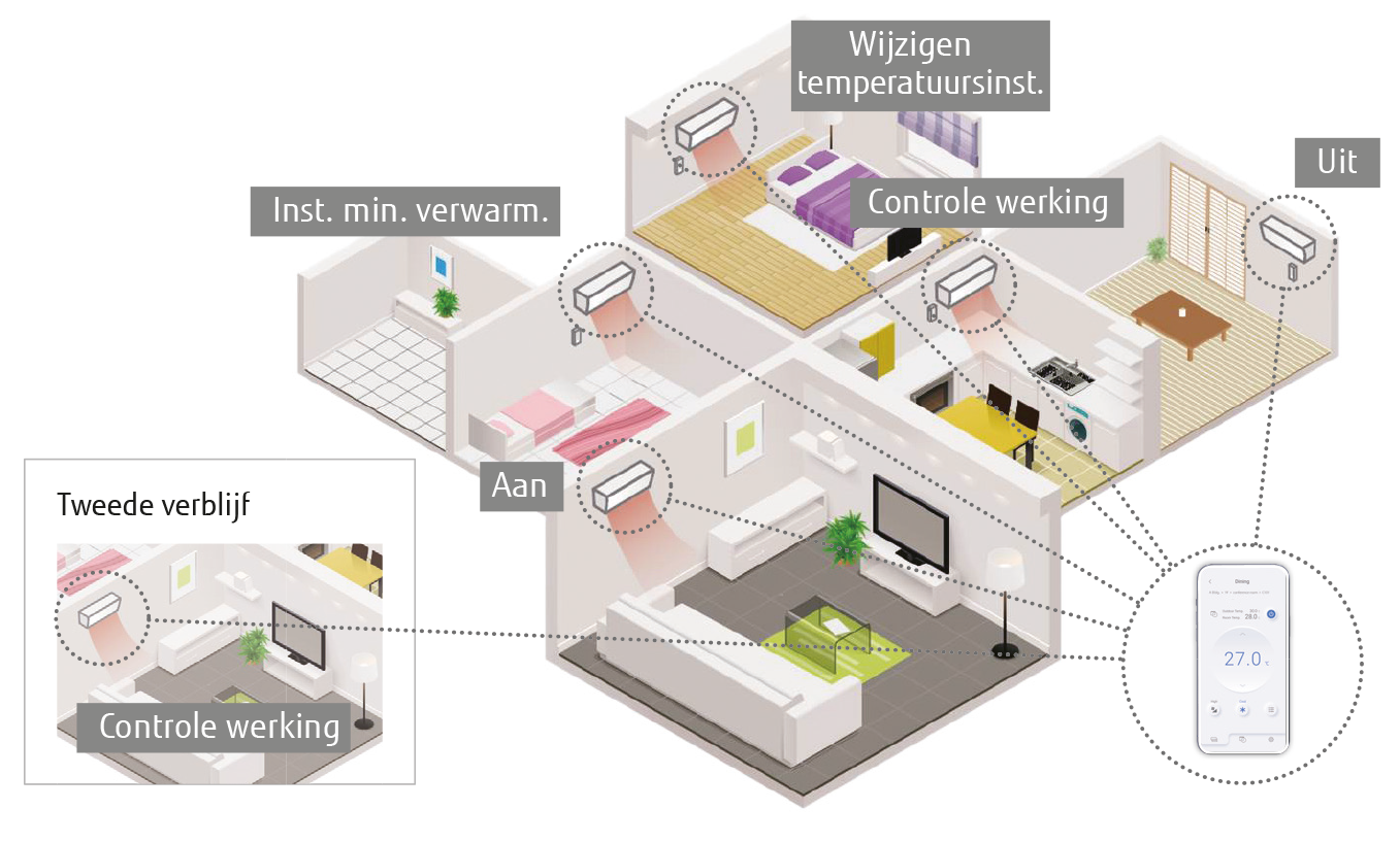De meeste van onze Fujitsu Airstage modellen zijn compatibel met de Airstage Mobile App dankzij de ingebouwde WiFi-functionaliteit. Voor modellen zonder ingebouwde WiFi bestaat de mogelijkheid om een WiFi-module te integreren, waardoor ook deze units compatibel worden met de App. Voor gedetailleerde informatie over de compatibiliteit van specifieke modellen kunt u de productpagina’s op onze website raadplegen of contact opnemen met uw installateur.